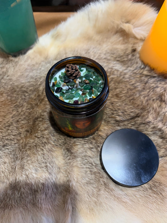 Chaque création renferme également une ou plusieurs pierres, choisies avec soin pour leurs propriétés vibratoires. La flamme vient activer leur énergie, tandis que la bougie permet de les conserver, de les charger et de les accompagner dans le temps. Une fois la bougie consumée, la pierre peut continuer son chemin auprès de vous, imprégnée du rituel vécu.