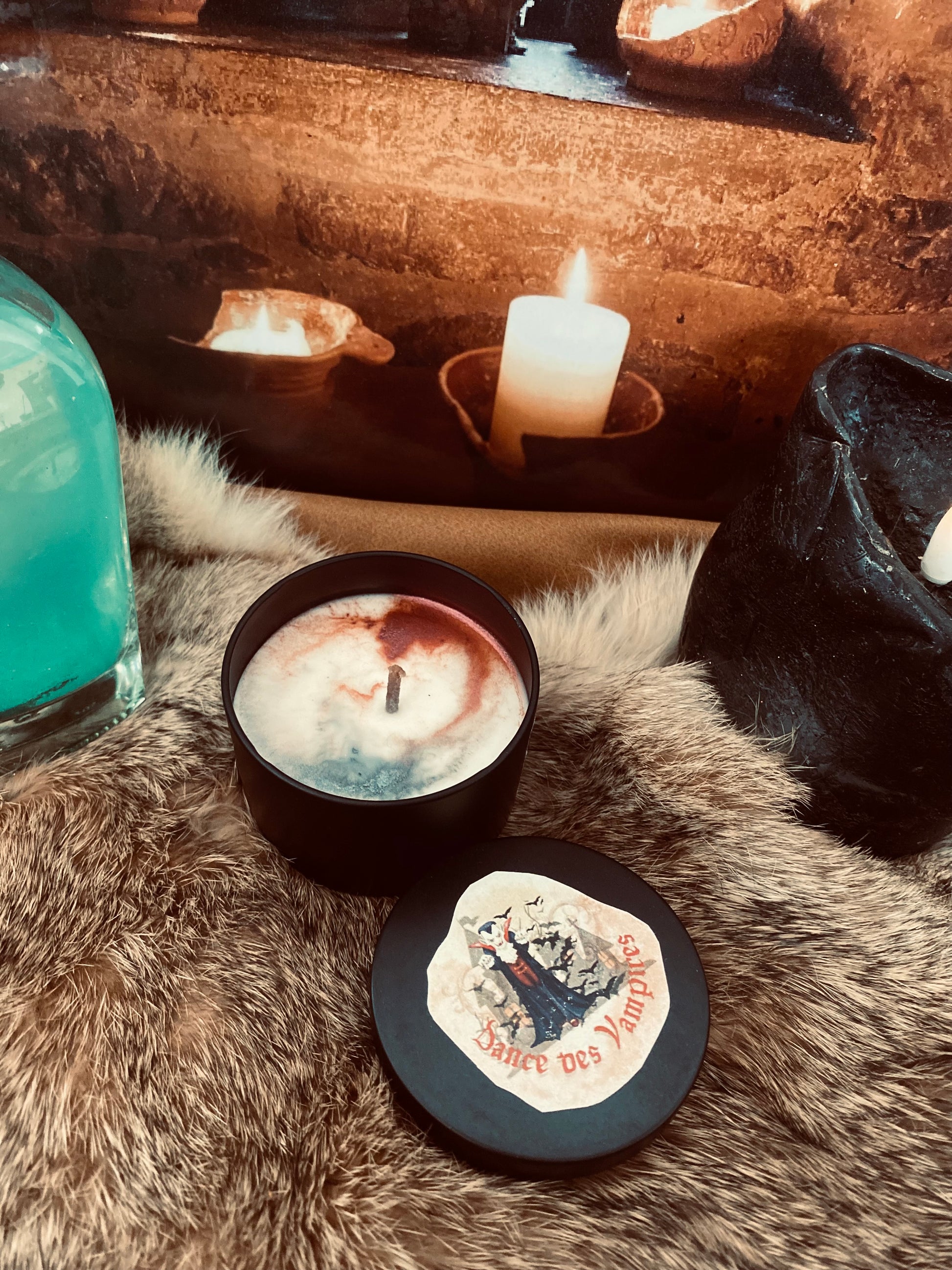 Bougie médiévale parfum Dance des Vampires - poids 75g (93% de cire de soja végétale biodégradable et non testée sur les animaux, 7% de parfum de Grasse).