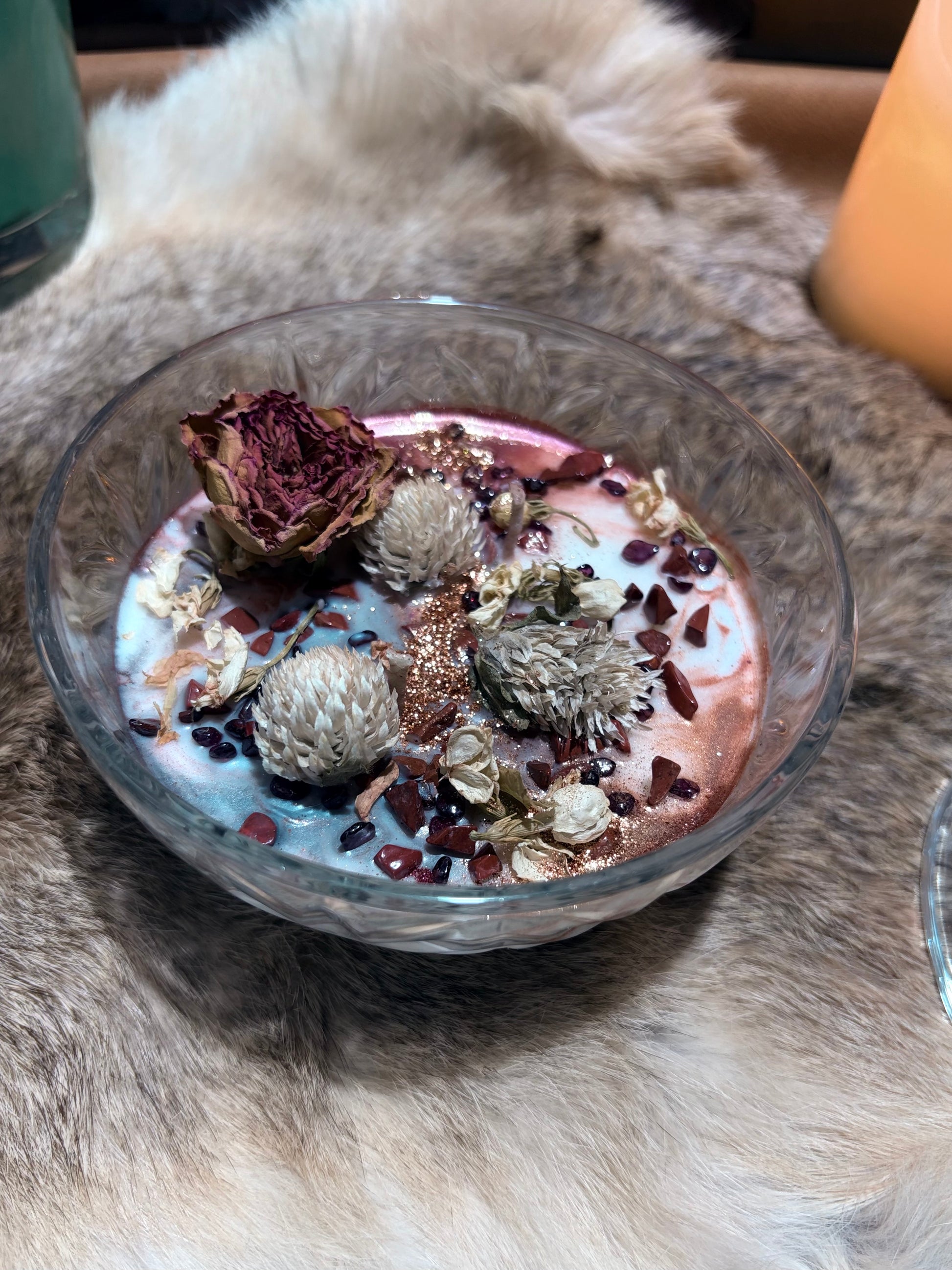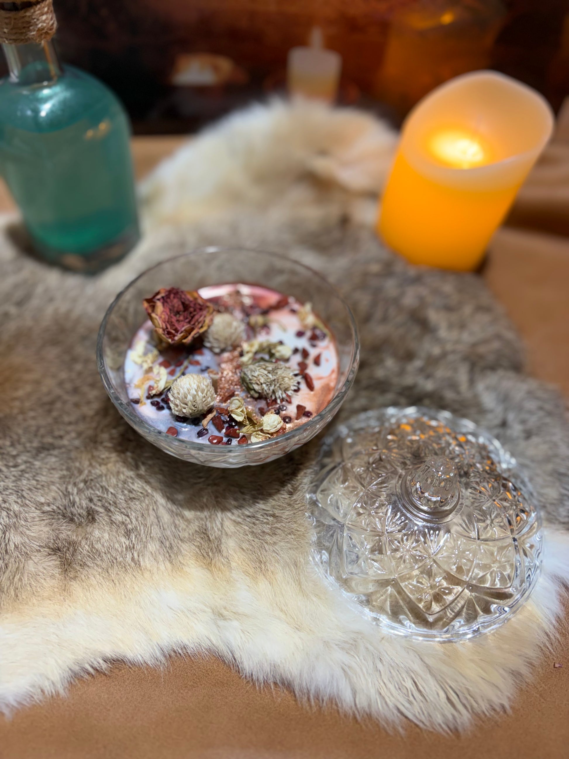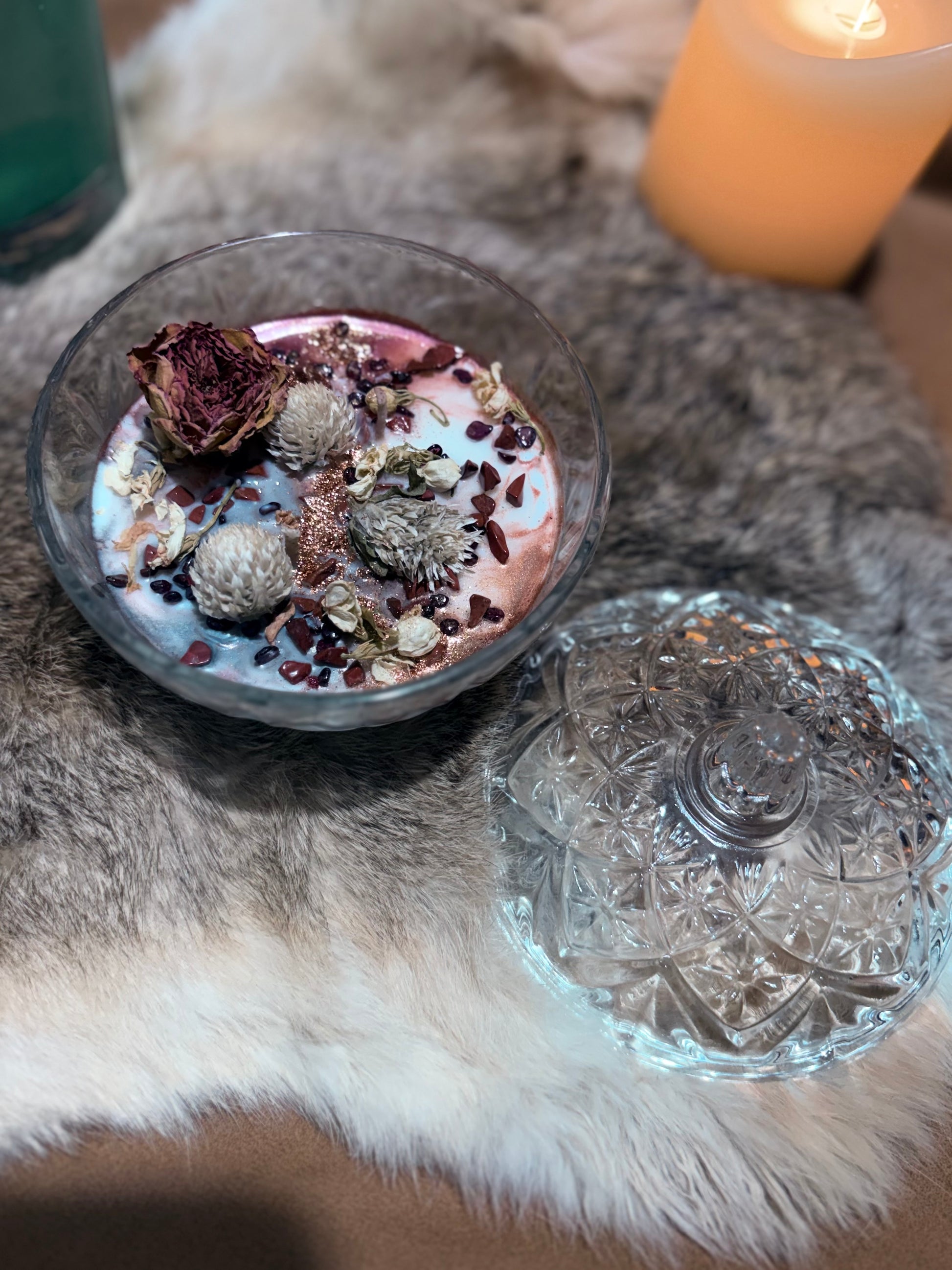 Mettez votre bougie à l'abri des courants d'air. Par mesure de sécurité, retirer les inclusions de fleurs séchées ou bâtonnets avant l'allumage.