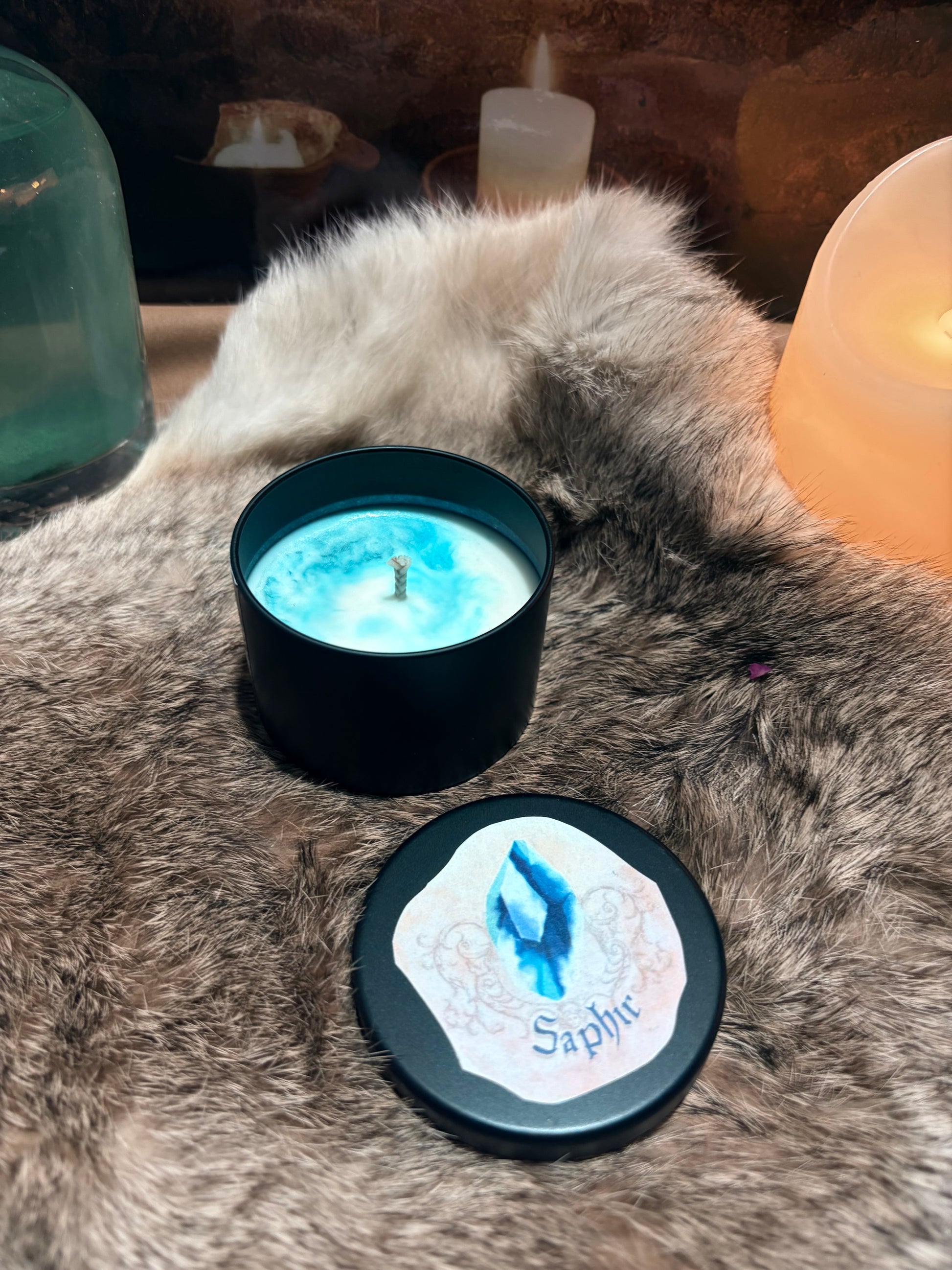 Mini bougie médiévale parfum Saphir - poids 75g (93% de cire de soja végétale biodégradable et non testée sur les animaux, 7% de parfum de Grasse).