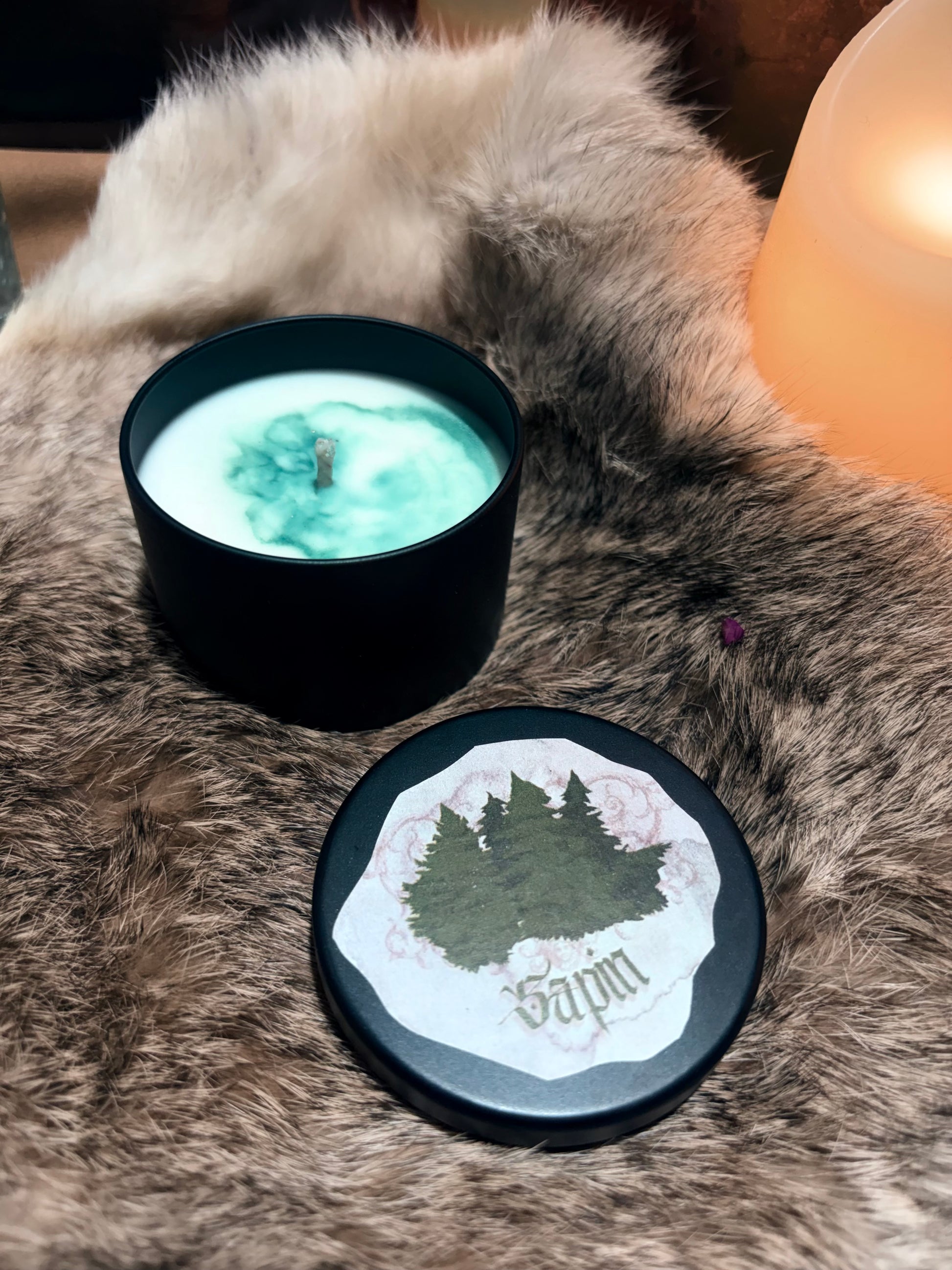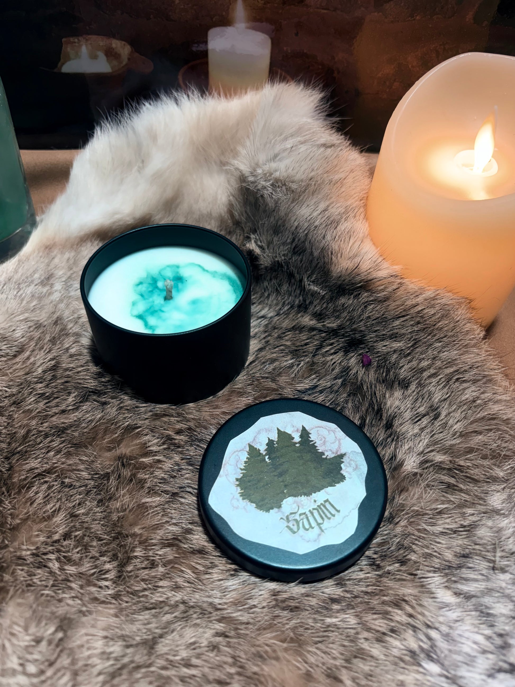 Mini bougie médiévale parfum Sapin - poids 75g (93% de cire de soja végétale biodégradable et non testée sur les animaux, 7% de parfum de Grasse).
